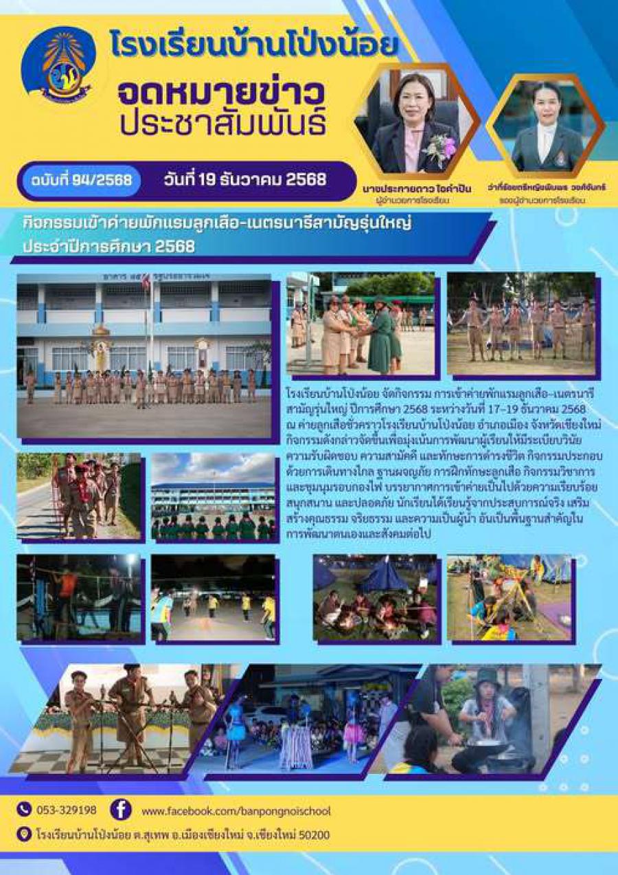 โรงเรียนบ้านโป่งน้อย จัดกิจกรรม การเข้าค่ายพักแรมลูกเสือ–เนตรนารีสามัญรุ่นใหญ่ ปีการศึกษา 2568 ระหว่างวันที่ 17–19 ธันวาคม 2568 ณ ค่ายลูกเสือชั่วคราวโรงเรียนบ้านโป่งน้อย อำเภอเมือง จังหวัดเชียงใหม่ กิจกรรมดังกล่าวจัดขึ้นเพื่อมุ่งเน้นการพัฒนาผู้เรียนให้มีระเบียบวินัย ความรับผิดชอบ ความสามัคคี และทักษะการดำรงชีวิต กิจกรรมประกอบด้วยการเดินทางไกล ฐานผจญภัย การฝึกทักษะลูกเสือ กิจกรรมวิชาการ และชุมนุมรอบกองไฟ บรรยากาศการเข้าค่ายเป็นไปด้วยความเรียบร้อย สนุกสนาน และปลอดภัย นักเรียนได้เรียนรู้จากประสบการณ์จริง เสริมสร้างคุณธรรม จริยธรรม และความเป็นผู้นำ อันเป็นพื้นฐานสำคัญใน การพัฒนาตนเองและสังคมต่อไป