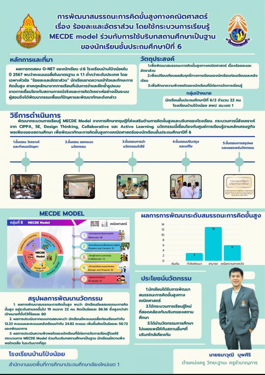การพัฒนาสมรรถนะการคิดขั้นสูงทางคณิตศาสตร์ เรื่อง ร้อยละและอัตราส่วน โดยใช้กระบวนการเรียนรู้ MECDE model ร่วมกับการใช้บริบทสถานศึกษาเป็นฐาน ของนักเรียนชั้นประถมศึกษาปีที่ 6 S:0